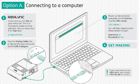 - 物理连接:将 pi-top Display Cable 一端插入主机的 “绿色 Display 接口”,另一端通过 “USB-A 适配器” 连接电脑的 USB-A 端口(若电脑仅含 USB-C 口,需额外准备 USB-A 转 USB-C 转接器);