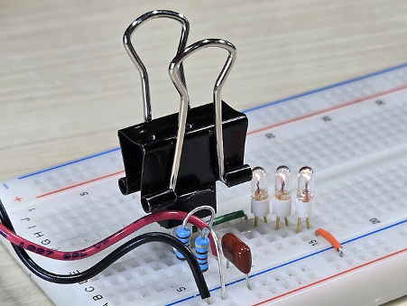 图 1:LM317 稳压器工作台实验装置,采用文件夹作为散热片,三个 7268 型白炽灯作为负载