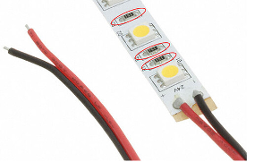 恒压驱动器通过为 led 提供固定电压来工作。它通过调节电流输出来维持整体功率水平。如果你的 led 或 led 灯条明确标明适用于特定电压,那么恒压驱动器可能是你的最佳选择。恒压驱动器通常有 12V 或 24V 两种规格。恒压驱动器相对恒流驱动器来说价格更低,因为它所需的组件更少。此外,恒压驱动器在更换led时也更容易。你可以根据需要添加或移除 led,只要电压要求保持不变,驱动器应能增加或减少电流以适应新的设置(前提是所有led的电流要求在驱动器的范围内)。使用它们时,你的 led 需要具备内置的过流保护(OCP)。通常,这是通过电阻器实现的,正如下方 DigiKey 型号 289-1316-ND 中红圈标出的那样: