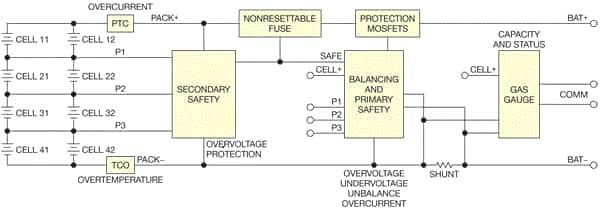请注意,上述电池管理系统 (BMS)包含两层保护。一级保护由“均衡和一级安全”模块以及“保护 MOSFET”模块组成。二级保护由“二级安全”、“PTC”、“TCO”和“不可复位熔断器”模块组成。通常,一级保护和电量计组件会集成到一个集成电路 (IC) 中,该 IC 可能包含上述未列出的其他保护功能,例如过温/欠温保护和电池认证。BMS 的各个组件可以集成到电池组(组侧)、应用程序本身(系统侧)或两者的某种组合中。