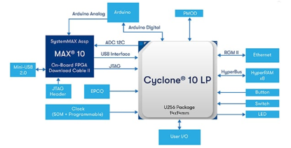 对 Cyclone 10 LP 感兴趣的开发人员可以使用 EK-10CL025U256 Cyclone 10 评估套件(图 4)对该系列进行评估。该电路板提供 Arduino UNO R3 和 Digilent Pmod 连接器,扩展方便简单。其他特性包括 GbE、USB 2.0、128 Mb SDRAM 和 64 Mb 闪存。