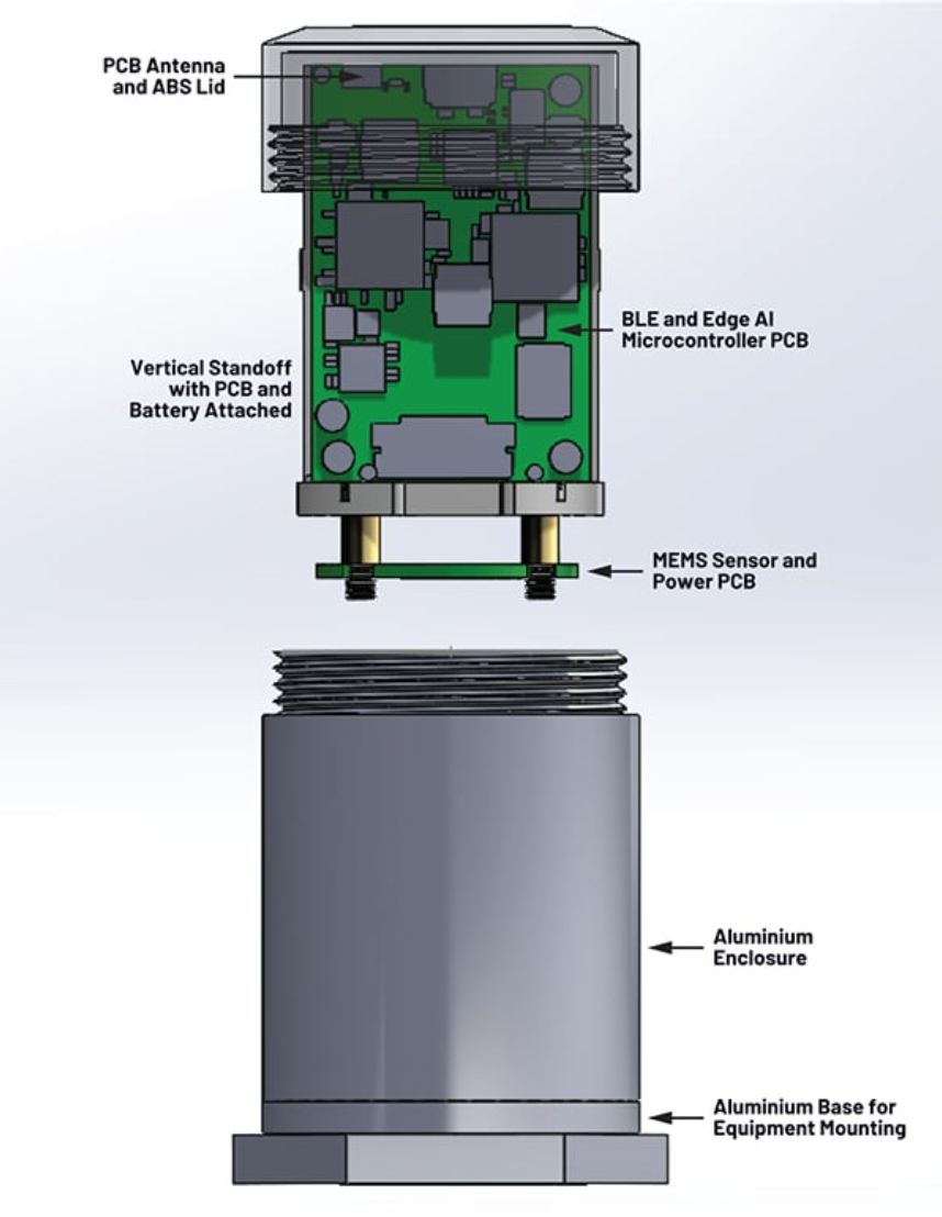 该套件的印刷电路板 (PCB) 上安装了 ADI IC 和其他组件(图 2),具体包括 ADXL382 和 ADXL367 三轴数字输出 MEMS 传感器、BLE MAX32666MAX78000 AI 微控制器、PMIC MAX20335 以及功率器件 MAX17262 和 MAX38642。已装配好的印刷电路板垂直安装在铝制底座上,电池连接在支座上。该装配好的 PCB 垂直安装在铝底座上,电池则固定在一个支座上。底座上还有一个 M6 螺纹孔,用于将螺柱安装到电机外壳上。然后,整个装置被封装在一个直径 46 mm、高 77 mm 的铝制外壳中。