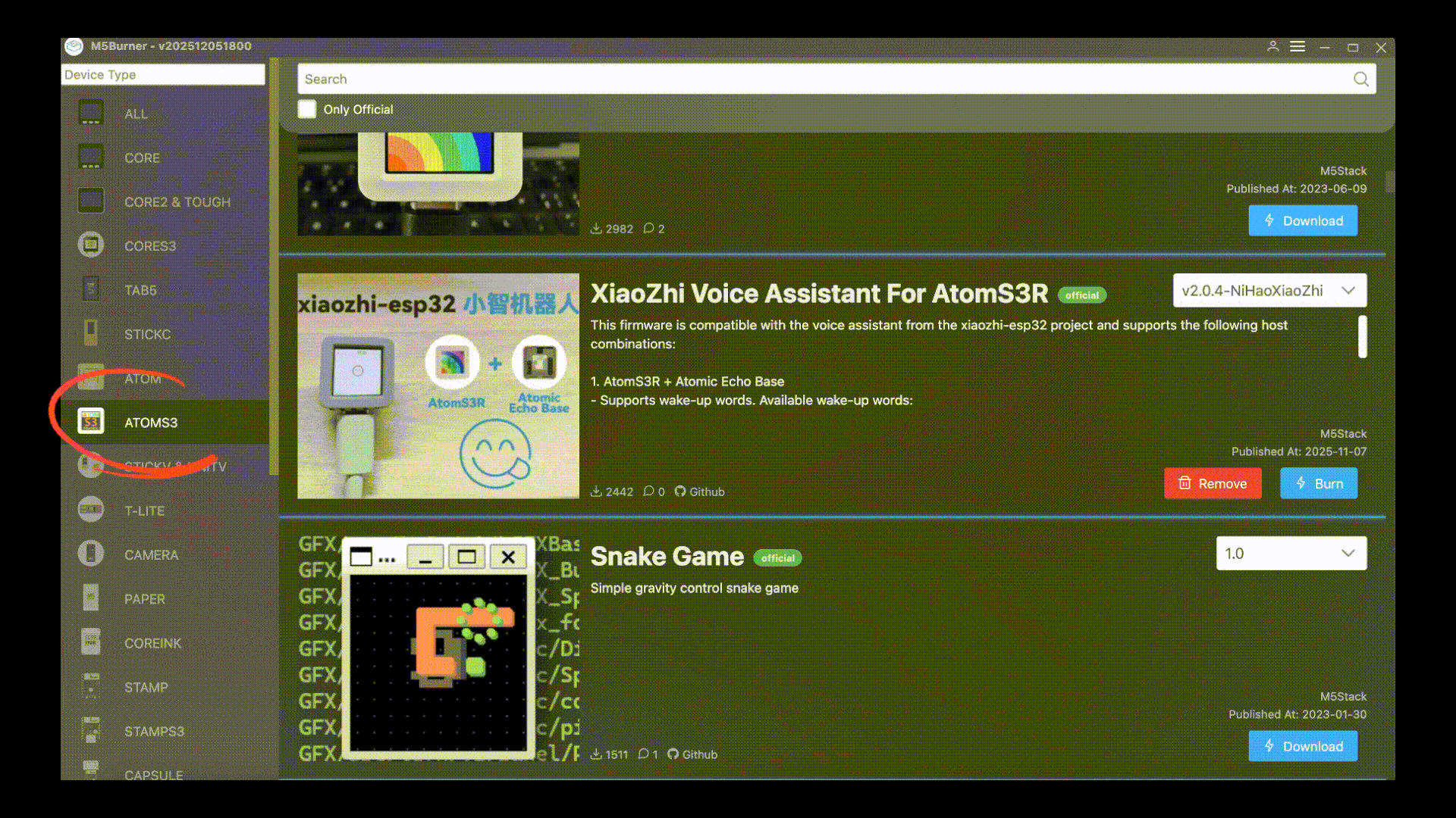 打开 M5 Burner 工具,在左侧菜单中选择对应的 AtomS3 设备类型,点击烧录语音助手固件,工具会自动完成固件安装,全程一键操作,不用手动编写代码,小白也能轻松搞定。