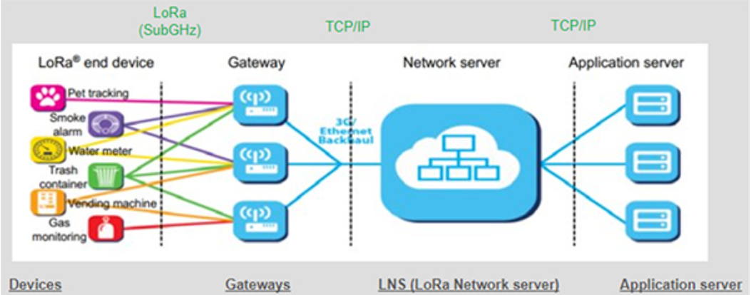 LoRaWAN 在现有的无线连接选项中已成为一种有效的解决方案,适用于基于服务器的应用,可与远在 Wi-Fi 或蓝牙等常用无线方案覆盖范围之外的低功耗终端设备连接。在 LoRaWAN 网络中,应用服务器通过传统的传输控制协议/互联网协议 (TCP/IP) 网络与 LoRaWAN 网关通信(图 1)。