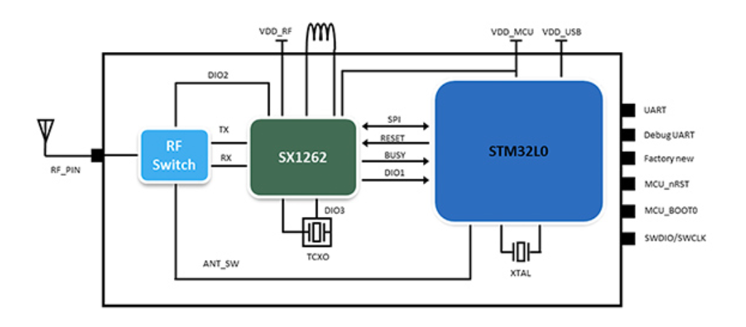 图 6:使用 Murata Electronics 的 LBAA0QB1SJ-296 模块,开发人员只需增加几个元器件,就能在其终端设备设计中添加经过认证的 LoRaWAN 连接。(图片来源:Murata Electronics)