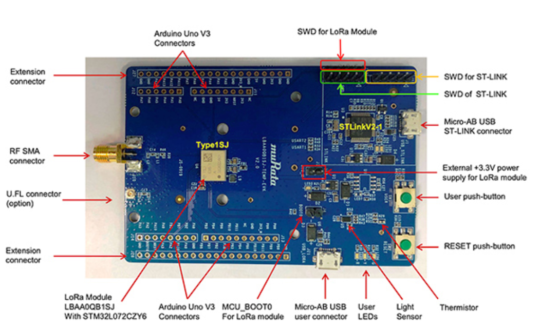 图 7:Murata 的 LBAA0QB1SJ-TEMP-EVK 评估板将 LBAA0QB1SJ-296 模块与外设和连接器结合在一起,旨在加快 LoRaWAN 连接的评估和原型设计。(图片来源:Murata Electronics)