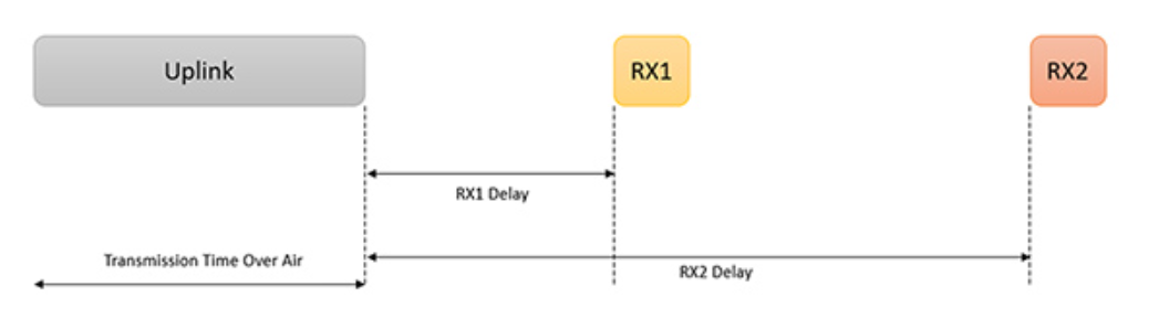 图 2:能效最高的 LoRaWAN 类别(A 类操作)让设备尽可能长时间休眠,仅在向网关传输(上行链路)数据时才开始工作,并在上行链路完成后打开第 1 个接收窗口 (RX1) 和第 2 个接收窗口 (RX2)。(图片来源:Murata Electronics)