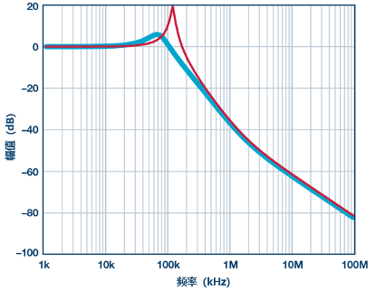 滤波器响应如下图所示,红线是原始的LC电路响应曲线,蓝线是改进后的响应曲线。我们看到Q值减小了。