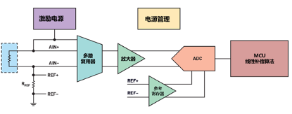 如下图,当提供热敏电阻和RSENSE的激励电压VREF与用于测量的ADC参考电压相同,则系统可以配置为比率测量,以便消除与激励电压源相关的任何误差。