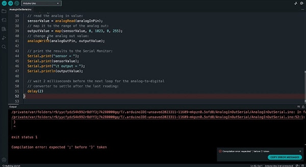 您可能遇到的第一个主要问题是点击“验证”按钮时出现编译问题。如果出现问题,您会在草图下方的控制台窗口中看到红色错误信息。第一步始终是阅读错误消息。