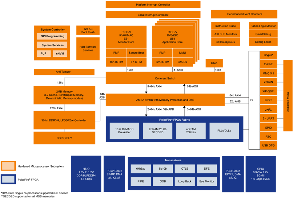 Microchip的PolarFire SoC FPGA包括中端收发器、逻辑、数字信号处理(DSP)和随机存取存储器(RAM)资源的组合,由于其不受单粒子翻转(SEU)问题的影响,并且所有存储器都包含单次纠错双次错误检测(SECDED),因此是安全关键型应用的理想选择。这些器件实现了高度集成的设计,每瓦特功效比同类产品高出两倍。同时,低功耗和发热少的特性简化了系统设计时主动冷却、风扇或散热片的成本和复杂性,能够支持那些要求散热少、集成度更高、对安全性和可靠性更为敏感的应用。